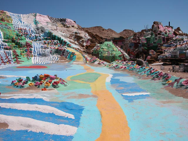 You are in a flat, blue, ocean-like area that offsets the "island" of Salvation Mountain. The best way to move around here is by following the yellow pathways, which also continue up the mountain.