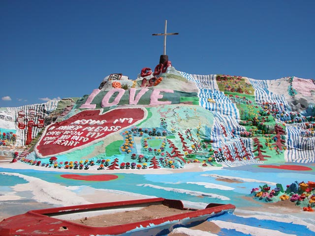 You are in a flat, blue, ocean-like area that offsets the "island" of Salvation Mountain. Painted waterfalls stream down the mountainside.