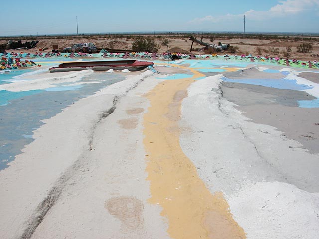 You are in a flat, blue, ocean-like area that offsets the "island" of Salvation Mountain.