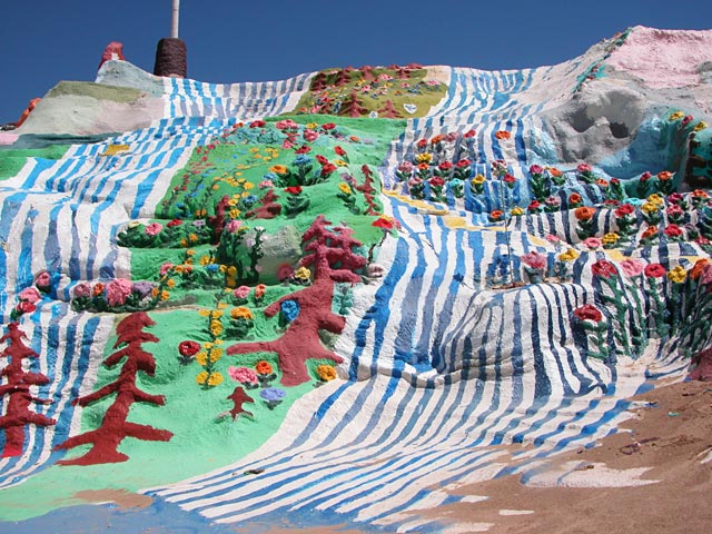 You are in a flat, blue, ocean-like area that offsets the "island" of Salvation Mountain. The best way to move around here is by following the yellow pathways, which also continue up the mountain.