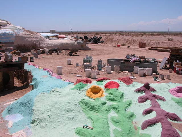 You are in a flat, blue, ocean-like area that offsets the "island" of Salvation Mountain. The best way to move around here is by following the yellow pathways, which also continue up the mountain.