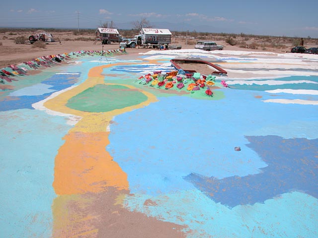 You are in a flat, blue, ocean-like area that offsets the "island" of Salvation Mountain. The best way to move around here is by following the yellow pathways, which also continue up the mountain.