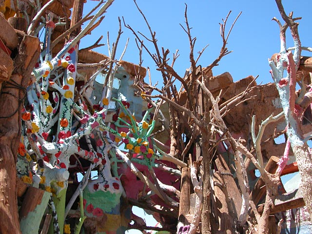These tree branches and beams seem to be providing structural support for the surrounding hay bales and adobe.