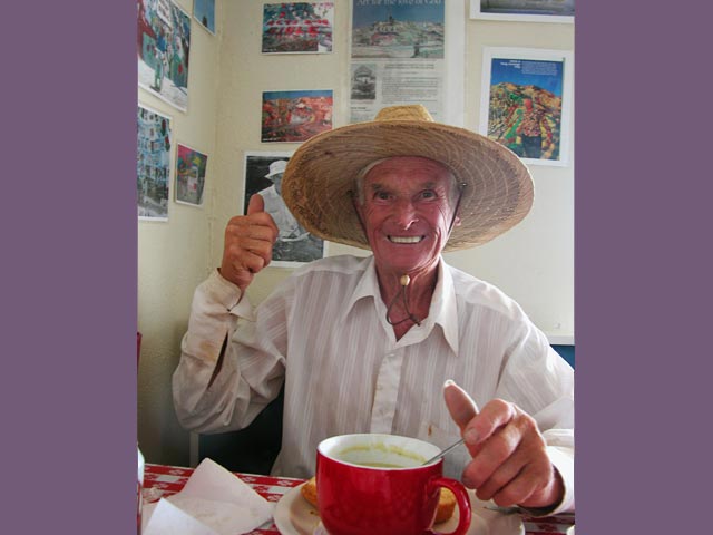 You offer Leonard Knight a cash donation, but he asks you to buy him a meal instead. Knight enjoys some soup while telling you many stories – and emphasizes how happy he is to spread the message that "God Is Love."
