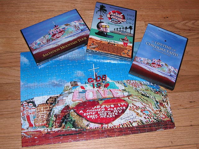 As you part ways, Leonard Knight gives you a bunch of memorabilia to remember him by, including some DVDs, a picture puzzle, and a large number of "Salvation Mountain" postcards (not pictured).