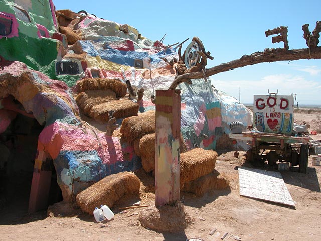 You're inside a gated cranny to the south of Salvation Mountain. From here there are several mysterious doorways.