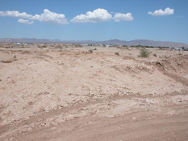 You are on a dirt road that winds uphill around the north side of Salvation Mountain.