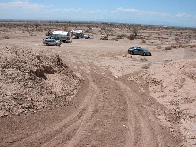 From here the hill approaches the main driveway area in front of the Salvation Mountain site.