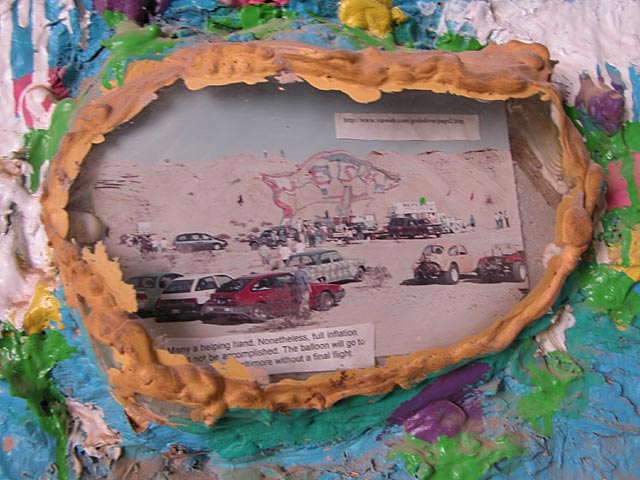 This photo shows people working on some sort of balloon. The site appears to be Salvation Mountain back when it was just dirt. Must have been a long time ago.
