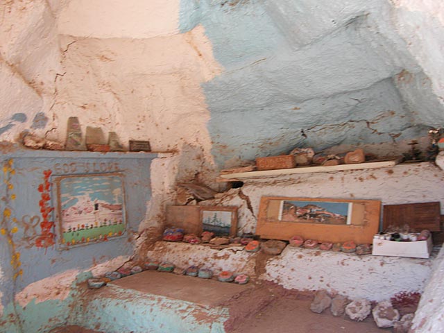 You are in a small hogan just south of Salvation Mountain. There are some modest decorations here.