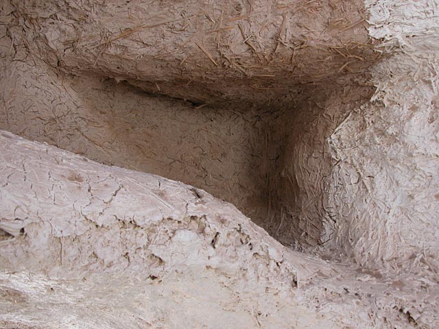 Made entirely of hay and adobe, the odd-shaped roof appears to be structurally sound.