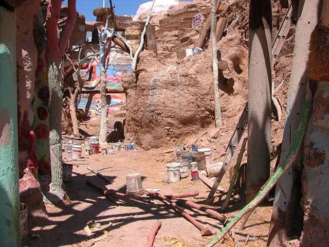 Paint buckets litter the ground. Be careful as you walk forward from here.