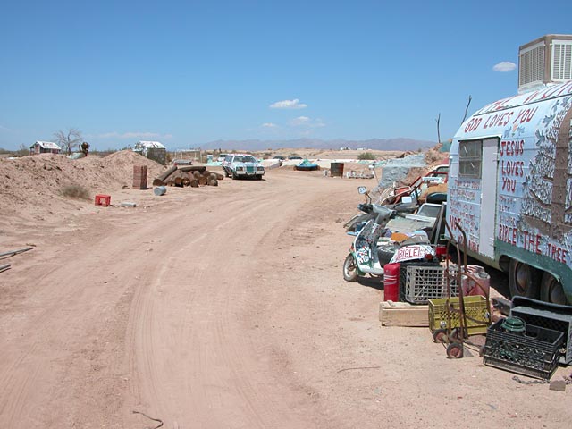 You are on a dirt road far to the southeast of Salvation Mountain. This area does not seem intended for the public.