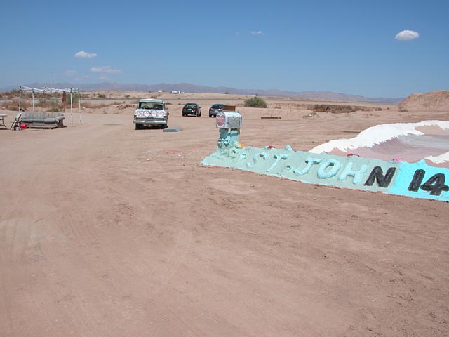 You are on a mysterious roadway that extends along the south side of Salvation Mountain.