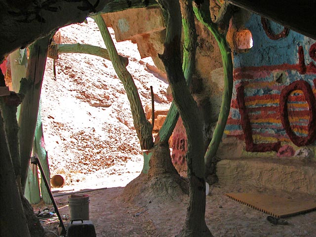 You've found a shaded and colorfully decorated alcove. On the floor is a cushion where somebody has recently been relaxing. Perhaps this person is nearby.